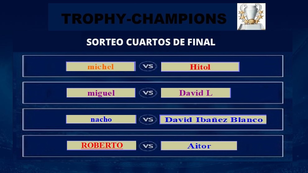 Ya tenemos los emparejamientos de los Cuartos de final de la Trophy-Champions, se disputaran los partidos de ida la jornada 29 y el partido de vuelta la jornada 30.