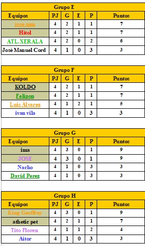 En caso de empate entre rivales, pasará el equipo con mejor puntos average entre ellos en caso de seguir empatados miraremos más puntos a favor.