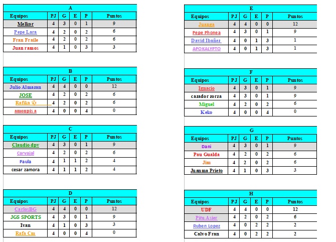 En caso de empate entre rivales, pasará el equipo con mejor puntos average entre ellos en caso de seguir empatados miraremos más puntos a favor.